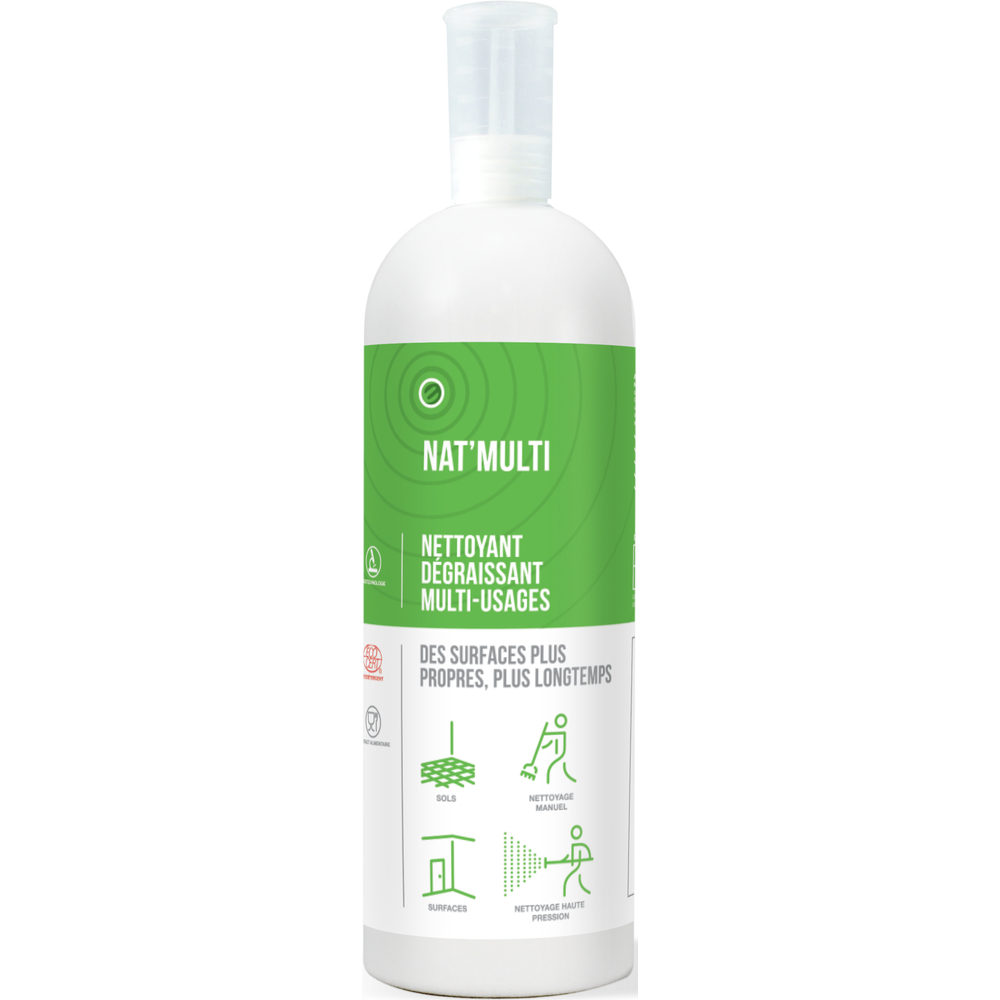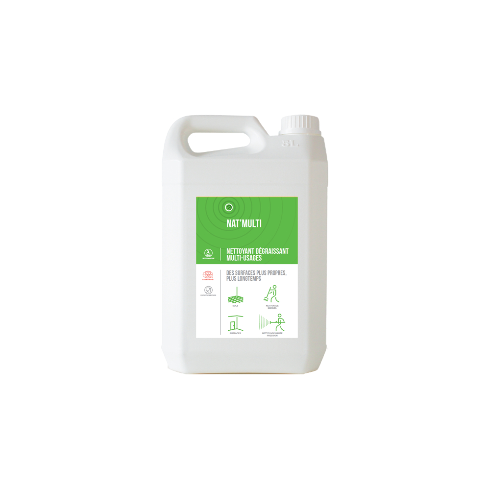 NAT'MULTI nettoie et dégraisse efficacement tous types de sols et de surfaces tout en diffusant un parfum qui procure une agréable sensation durable de propreté et de fraîcheur.