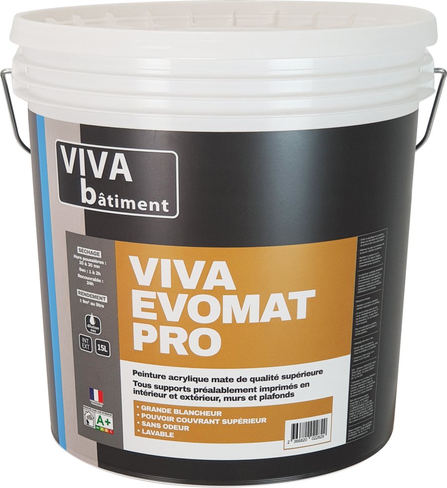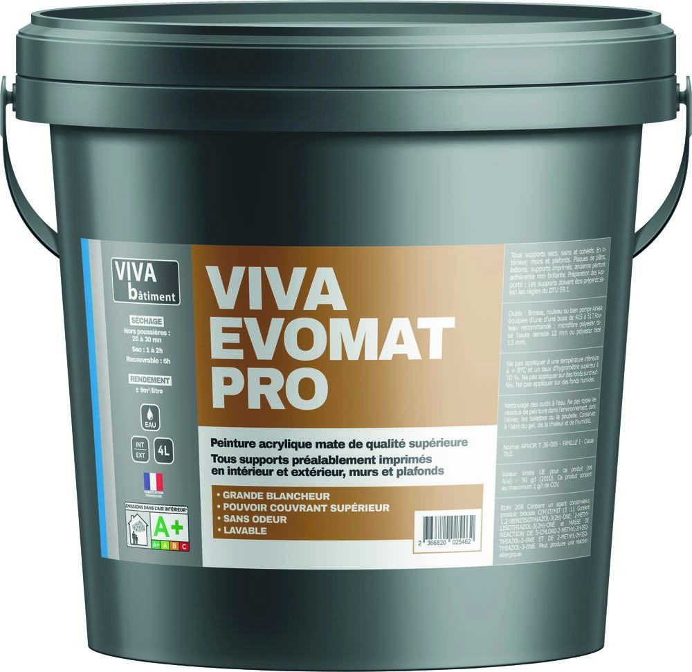Peinture acrylique mate de qualité supérieure . Tous supports préalablement imprimés des murs et plafonds en intérieur/extérieur.